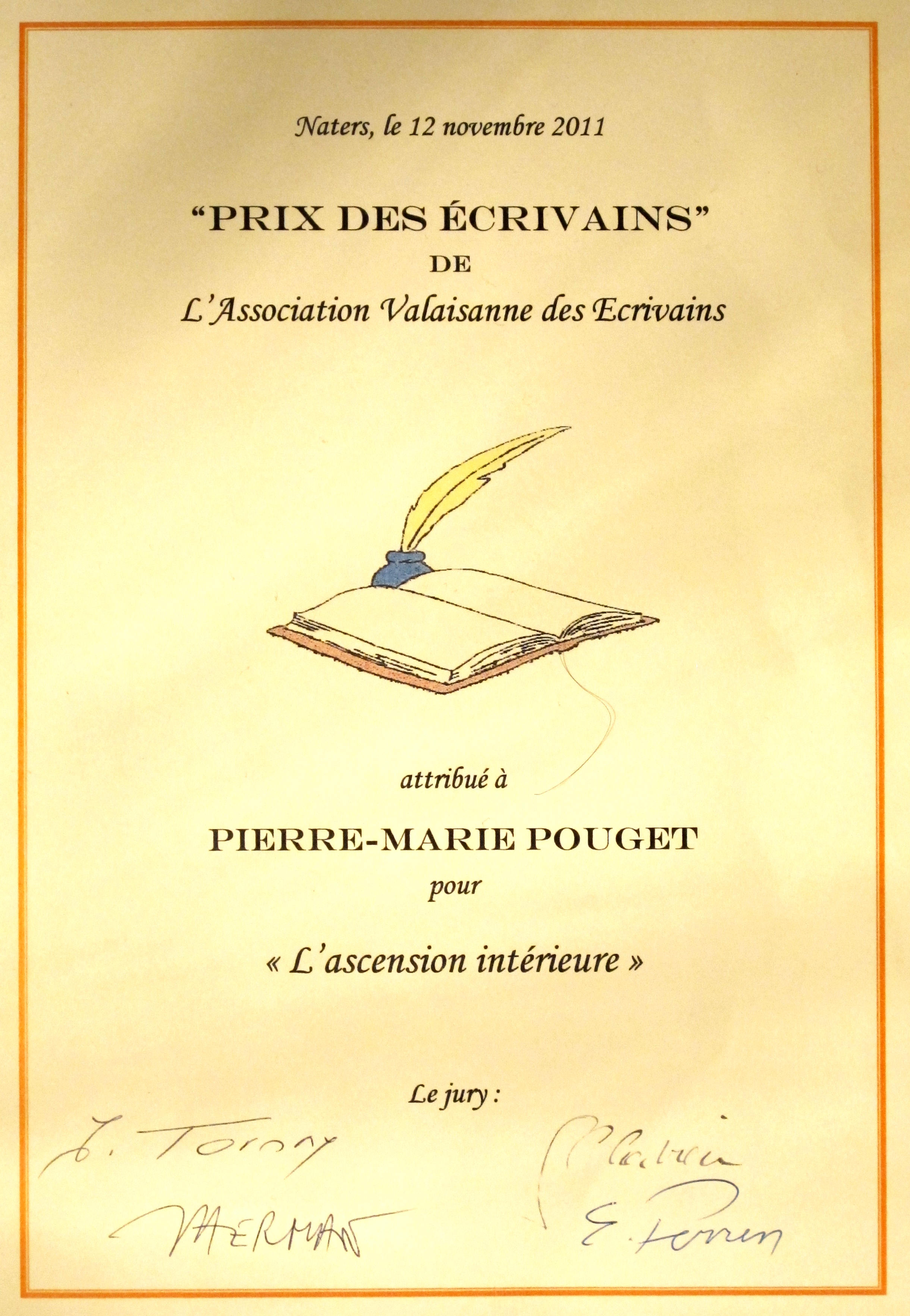 Prix des écrivains de l'Association Valaisanne des Ecrivains 2011 pour L'ascension intérieure.